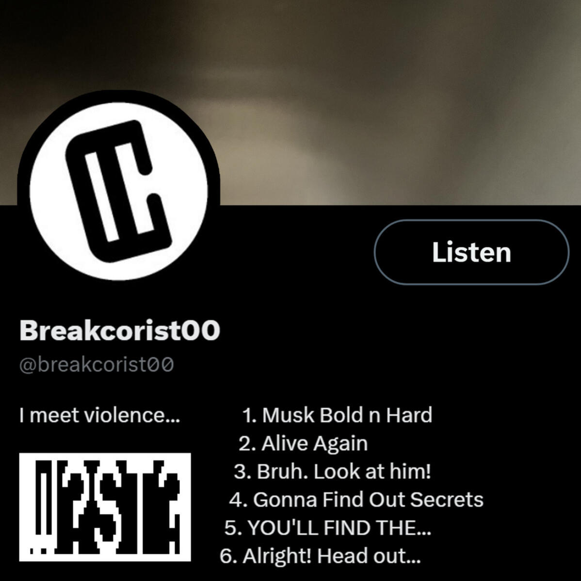 Breakcorist00Released his first album on September 3, 2020 being "It's Gonna Be Over Soon" onto newgrounds and streaming services. This album recieved positive reviews on newgrounds with the songs "About what" & "What about it" being frontpaged. Due to experimenting with this artist name, everything found under this name has been made free on bandcamp.